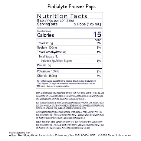 Popsicle Sugar-Free Ice Pops Each pop comes with only 15 calories and 0g of sugar. Sodium chloride and potassium. Pedialyte Powder Packs and Freezer Pops are not for use for children under 1 year of age.